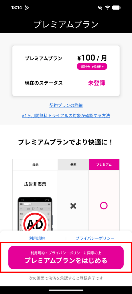 1. 画面下部の「プレミアムプランをはじめる」ボタンをタップします