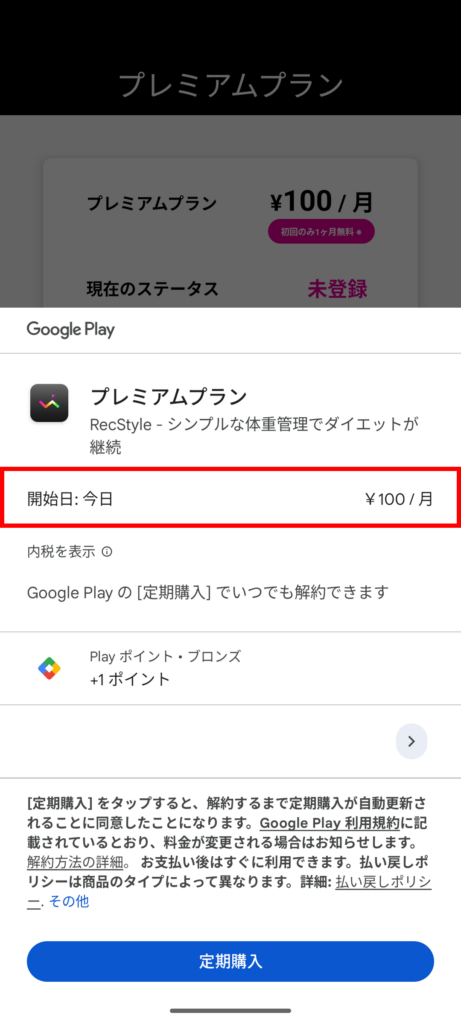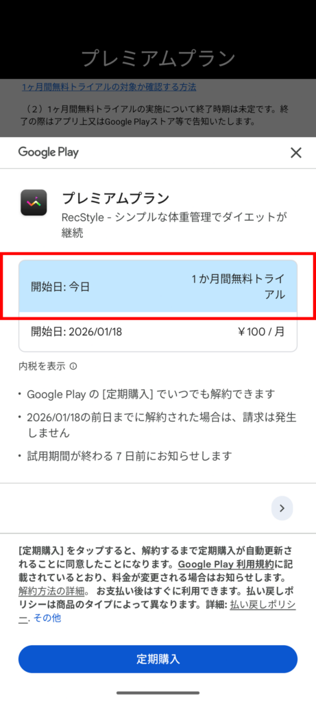 下記のGoogle Playモーダル画面で「1か月間無料トライアル」という記載がない場合、過去に無料トライアル経験があり、無料トライアルの対象とはなりません。